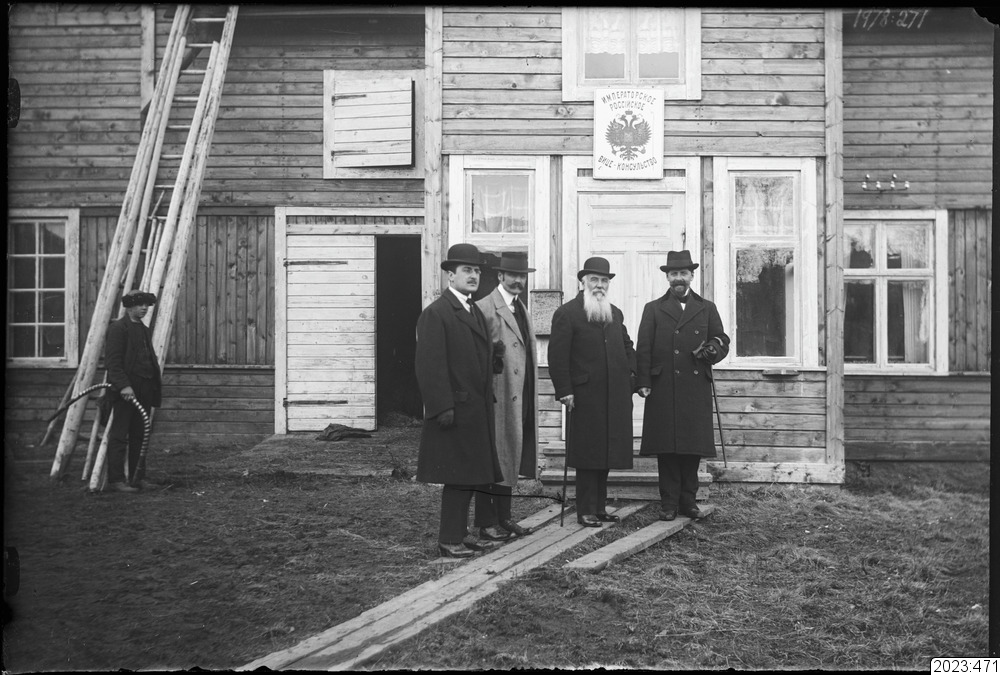 Ryska konsulatet inrymdes i John W. Lundbergs gård. Exteriörbild. Utanför konsulatet står fr.v. Serbiens kronprins Alexander, chefen för kungens kabinett Jancowitj, konseljpresident Pasic, visekonsul I. Verbitsky. Tid: 1914-1918. Fysiskt original från Haparanda kommun med accessionsnummer 1978:271