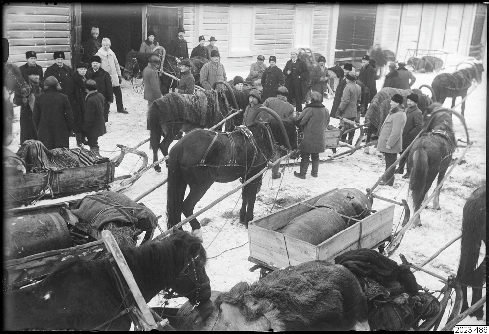 Vid tullen, smuggelgods. Uppköpare står och väntar medan finska smugglare förtullar från Finland insmugglade varor. Tid: 1914-1918. Fysiskt original från Haparanda kommun med accessionsnummer 1978:286