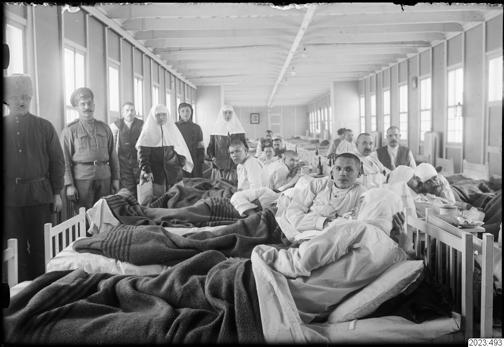 Krigsskadade och invalider liggande i sina sängar på Röda korsets sjukförläggning. Personal från Röda korset i bakgrunden. Tid: 1914-1918. Fysiskt original från Haparanda kommun med accessionsnummer 1978:293