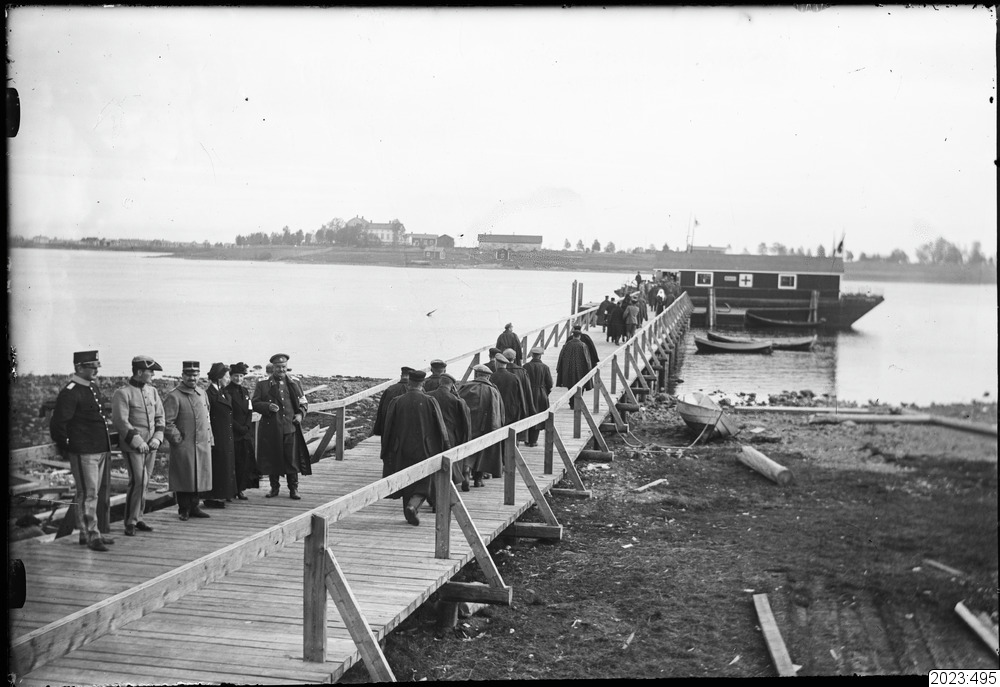 Ryska soldater och befäl på väg hem. Gående ner mot den väntande pråmen från Röda korset som skall ta dem över från Haparanda till Torneå. Tid: 1914-1918. Fysiskt original från Haparanda kommun med accessionsnummer 1978:295