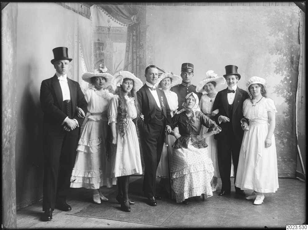 Gruppbild. I mitten sitter ung kvinna utklädd. Samma kvinna förekommer på bilder tagna vid 6:e juni festligheterna 1926. Fönstret i bakgrunden är förtäckt för detta fotograferingstillfälle. Tid: 1926. Fysiskt original från Haparanda kommun med accessionsnummer 1978:330