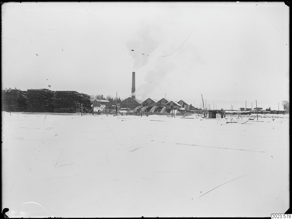 Träförädlingsanläggningen. Timmerupplag. Tid: 1920-tal. Fysiskt original från Haparanda kommun med accessionsnummer 1978:378