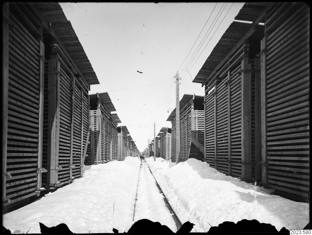 Brädgården med sitt järnvägsspår. Tid: 1920-tal. Fysiskt original från Haparanda kommun med accessionsnummer 1978:380