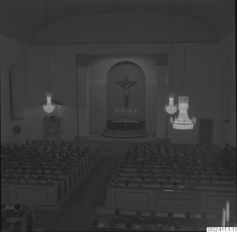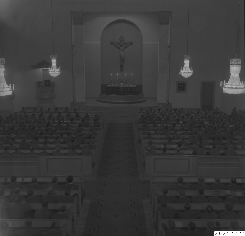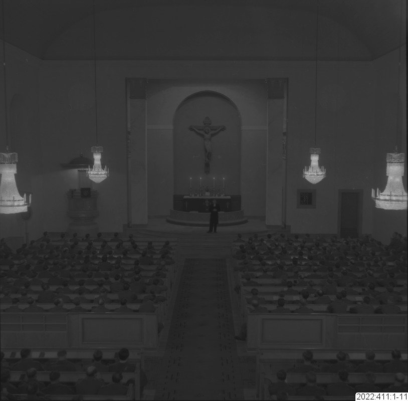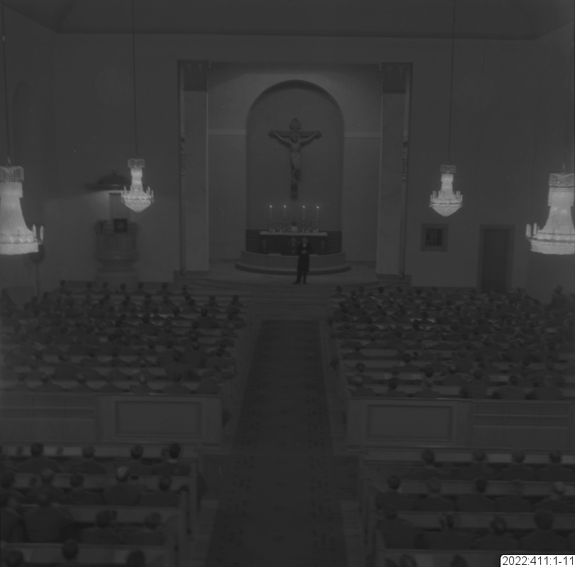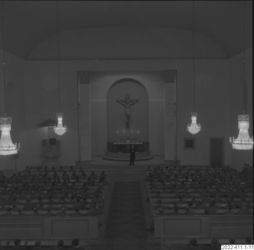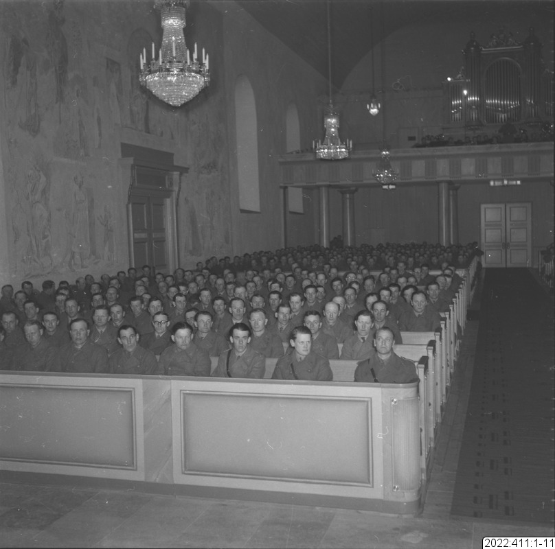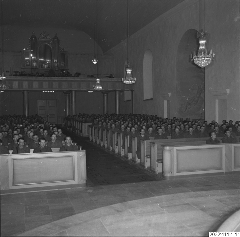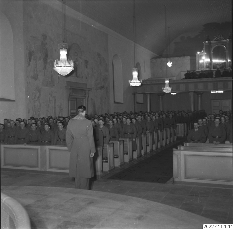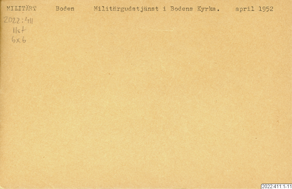 Militärgudstjänst i Bodens kyrka En av bilderna i serien (oftast den sista) visar det kuvert som Bert Persson förvarade bilderna i. Den maskinskrivna texten på kuvertet är Berts beskrivning av innehållet. Noteringar i blyerts är (för det mesta) skrivna av museipersonal.