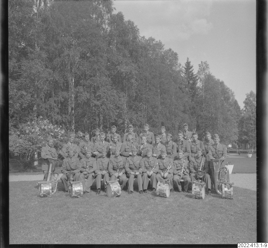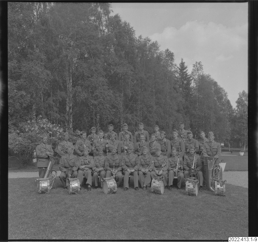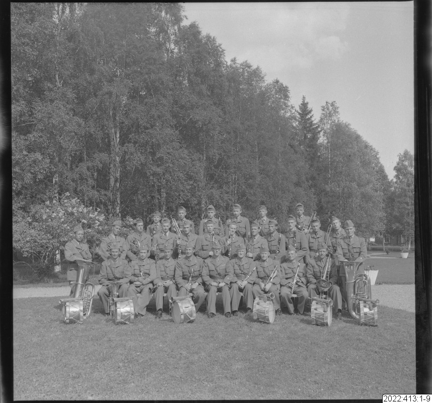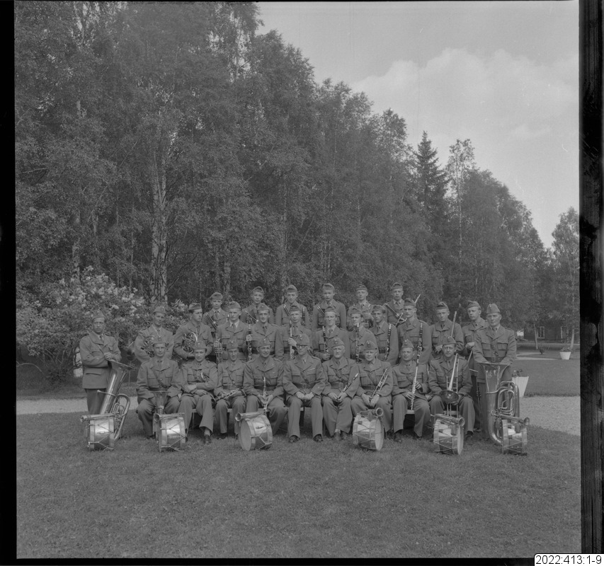 Musikkåren, I 19, Boden. En av bilderna i serien (oftast den sista) visar det kuvert som Bert Persson förvarade bilderna i. Den maskinskrivna texten på kuvertet är Berts beskrivning av innehållet. Noteringar i blyerts är (för det mesta) skrivna av museipersonal.
