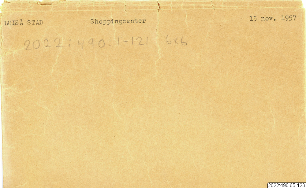 Luleå stad, Shoppingcenter En av bilderna i serien (oftast den sista) visar det kuvert som Bert Persson förvarade bilderna i. Den maskinskrivna texten på kuvertet är Berts beskrivning av innehållet. Noteringar i blyerts är (för det mesta) skrivna av museipersonal.