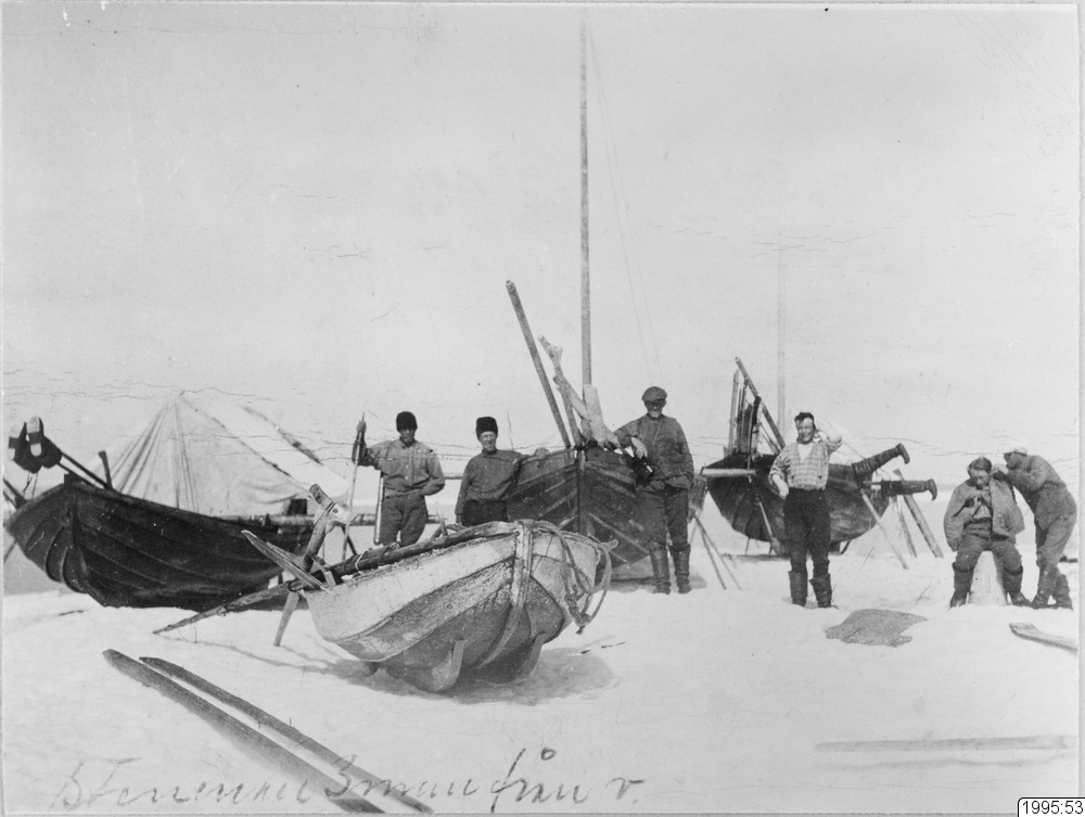 K.L. Stenman tredje man från vänster, tillsammans med två säljägare från Luleå. Observera mannen till höger som klipper eller avlusar håret på sin jaktkamrat. Storöhamn.