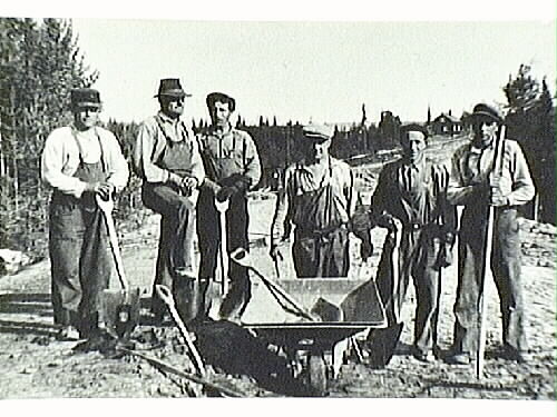 • Vägarbete vid Koskensilta. Fr.v. Auno Kero, Gustav Rehult, Karl Mattson, Rudolf Rantatalo, Oskar Kero och Hjalmar Uusitalo.