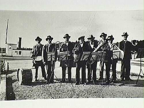 Bilden är tagen av Arvidsjaurs hornmusikkår vid båthamnen i Arjeplog under en utflykt sommaren 1927. Musikkåren spelade vid en danstillställning på lördagskvällen och gav före hemresan på söndag en liten utekonsert i Arjeplog. Från vänster: Per Stenlund, Gustav Marklund född 1895, Clas Stenlund, Hugo Stenlund, Hjalmar Engelmark, Hugo Fjellström, Hjalmar Högström, Anders Berggren.