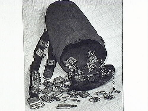 Skattfynd från Passekårså, Gällivare socken. I ett postskrin av järn, daterat till 1600-talet, låg denna rika familjeskatt av samiska silversmycken. Nbm inv nr 3141. Skatten hittades av Tomas Skum (Skino?) invid en offerplats.