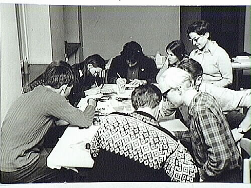 "Harald Albumkvällen". Från vänster: Josef Saers, Inger Möller, Bengt Jakobsson, Tua Franklin, Lisbeth Cardell, Mattias Kero, Rune Lindström och Egon Eltén (med ryggen mot kameran).