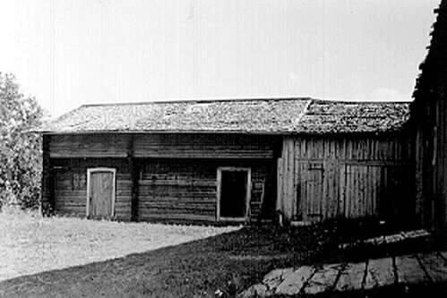 Gårdsplanen med stallet samt nybyggda bodar mm. Innanför den stängda dörren är boden. Den öppna dörren går in till stallet, som har plats för tre hästar. På stegen kan man komma upp genom utskottet på skullen. Utskottet har golv utanför boden, men inte utanför stallet.