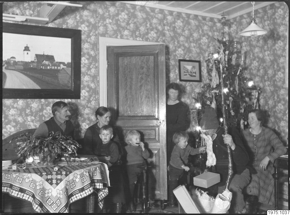 • Isi "Leur" i Långnäs. Julklappsutdelning. Från vänster: Alfred Andersson och hans fru på besök, Rune Lundström i dörren. Beda Önnervall, Arne Lundström, Linus Lundström (tomte) och Arne Lundström.