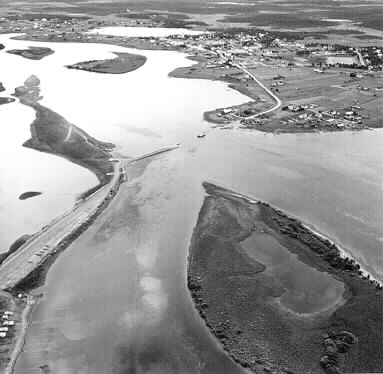 Vy av det centrala Vittangi och Vittangi-Suvanto med dess holmar och uddar. I mitten trafikerar färjan sitt norra läge på den långsträckta Törmänniitty och Nikkimäinen på den äldsta bydelen Niemi. Förlagan till den gamla Vittangipatografien är tecknad på Niemi över viken Kotolahti mot kyrkan