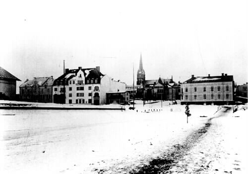 Södra hamnen, från vänster Folkets Hus Ripan (ALLIS) och därefter Hamnkontoret. Byggnaden uppe i backen är konsul Petterssons hus. I hörnet till höger syns konsul Burmans fastighet.