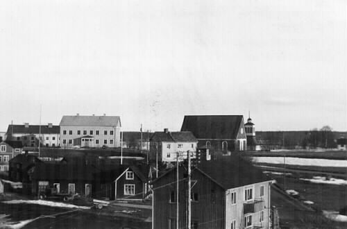 • Vy från Kalix med kyrkan i bakgrunden. Fotot är taget från Lantmannaförbundets tak i kvarteret Sirius.