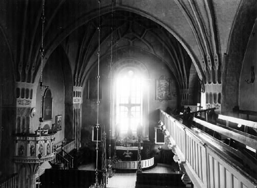 • Interiörbild från kyrkan i Kalix. Predikstol samma som 1924. Läktare samma som 1924. Tavlor på korvägg annorlunda än 1924. Målning i valv annorlunda än 1924.