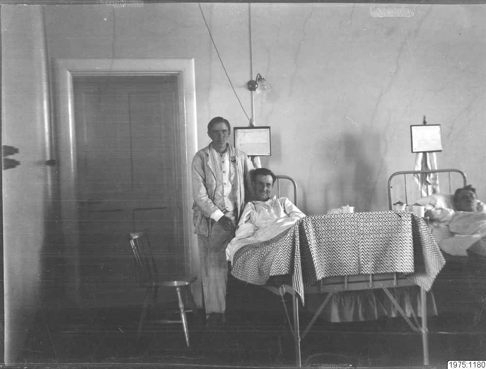 • Albin Thurfjell i sjuksängen på Hälsan i Antnäs. Bilden är från 1930-talet.