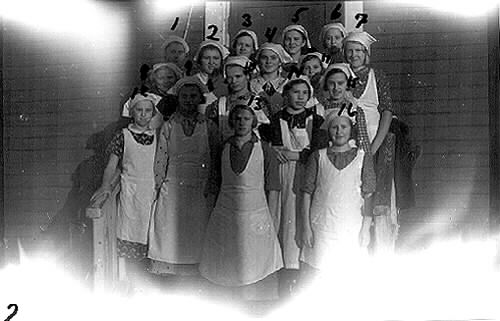 Skolkökselever i Alvik på 1930-talet. 1. Nanny Ahlen, 2. Elsa Olsson, gift Nilsson, 3. Lärarinnan Hanna Hornberg, 4. Anna Johansson, 5. Vivi Sandström, 6. Maj-Britt Sundström, 7. Valborg Johansson, 8. Adela Olsson-Eriksson, 9. Ally Sundström, 10. Mari Lindström, 11. Dagny Lundström, gift Olsson, 12. Lissi Karlsson-Örling, 13. Inga Karlsson, gift Johansson, 14. Lisa Selberg, gift Holmgren, 15. Alice Jonsson, gift Vallin, 16. Ingrid Eriksson, gift Ek.