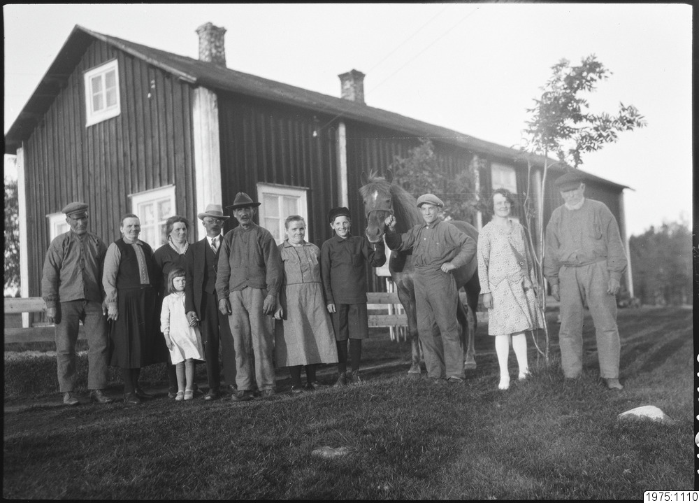 "Lärs-Erss"-gården i Alvik. Personer från höger: Janne Svensson, Ebba Nilsson, Herman Nilsson, Axel Nilsson, Mor Gravilda, Far Nils, Johan Nilsson, Karl August Nilsson med fru och dotter?, Maria och Fridolf Nyström "Bobb".
