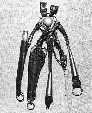 • Gehäng som samekvinnan bar vid sitt bälte. Innehåller kniv, sax i fodral, två nålhus, örslev.