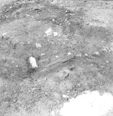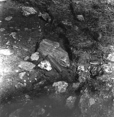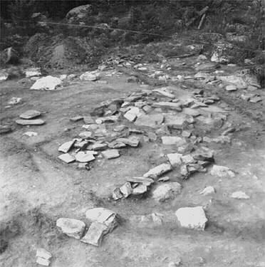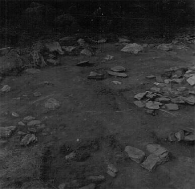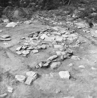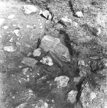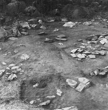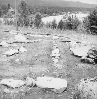 1-2. A3 spisröret från sydväst. 3-4. A3 västra delen från sydväst. 5-6. A5 södra väggen från väster. 7-8. A3 fynd järnstång p. 364 172. 9-10. A5 fynd borrstål p. 340 159. 11-12. Utsikt mot A1 från sydväst.