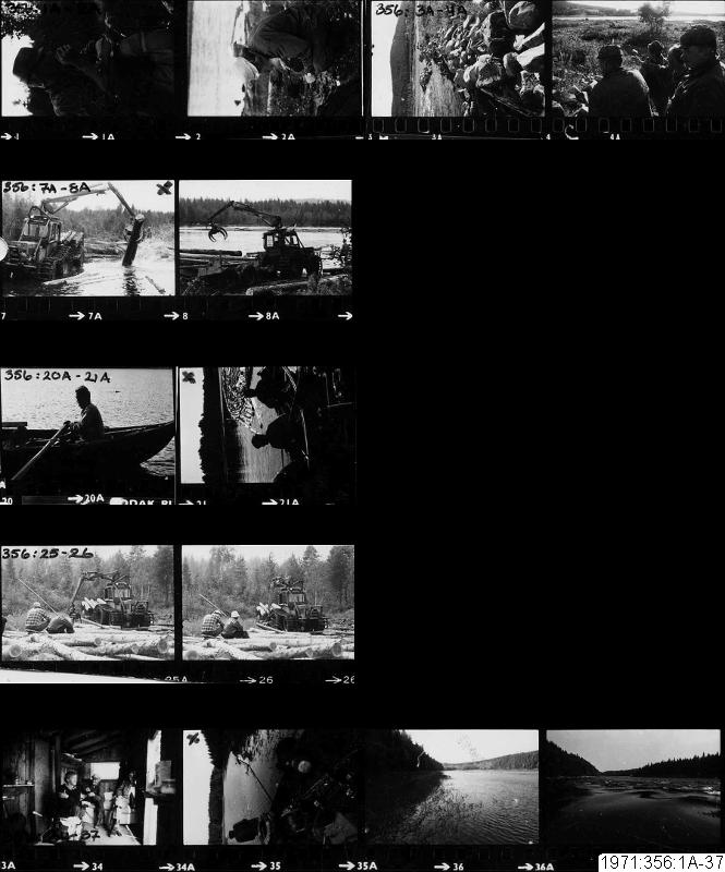 Dokumentation av flottning i Pite älv. 1A-2A. Ovan brudforsen, bland annat traktorer, augusti 1971. 3A-4A. Ovan brudforsen, bland annat traktorer, augusti 1971. 5A-6A. Bildrutor saknas. 7A-8A. Ovan brudforsen, bland annat traktorer, augusti 1971. 9A-19A. Bildrutor saknas. 20A-21A. Ovan brudforsen, bland annat traktorer, augusti 1971. Ny nummerordning. 25-26. Åkerselforsen, skogstraktorer, augusti 1971. 34-37. Interiör från spelhuset på ön i Bredselet, spelningsbilder nedom Bredselet, augusti/september 1971.