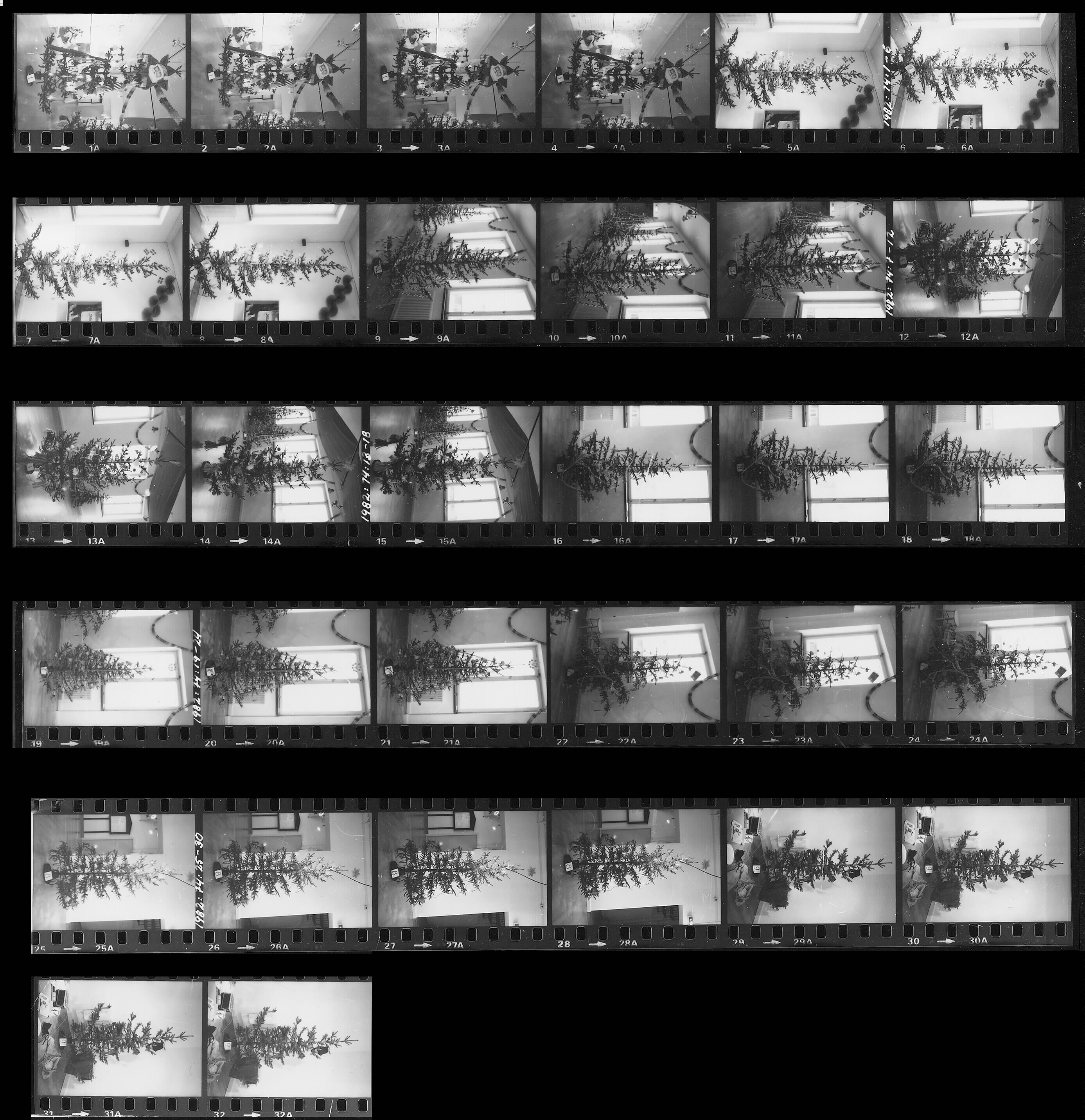 Luleå stad. Norrbottens museum. "Vem har klätt granen?". Julgransutställning 1981-12-13 - 1982-01-03 med frågetävling på Lucia-dagen. Producerad av Örjan Wallström, Göta Persson och Anders Wiklund, samtliga från Norrbottens museum. 1-4. Gran nr 1, klädd av Åke Candell, dekormålare på Norrbottensteatern. 5-8. Gran nr 2, den kulturhistoriska granen, klädd av Norrbottens museum. 9-11. Gran nr 3, klädd av textilkonstnär Gun Johansson, Luleå. 12-15. Gran nr 4, klädd av Margareta Forss, komminister i Örnäsets församling. 16-18. Gran nr 5, klädd av P-G Råberg, regionkapellmästare, Luleå. 19-21. Gran nr 6, klädd av konstnär Inger Andersson, Luleå. 22-24. Gran nr 7, klädd av Kjell Mickelsson, kulturnämndens ordförande i Luleå. 25-28. Gran nr 8, klädd av Norrbottens läns hemslöjdsförening. 29-32. Gran nr 9, badstrandsmiljö, iordningställd av konstnärerna Lotta Hellström och Lennart Holmbom, Gammelstad.
