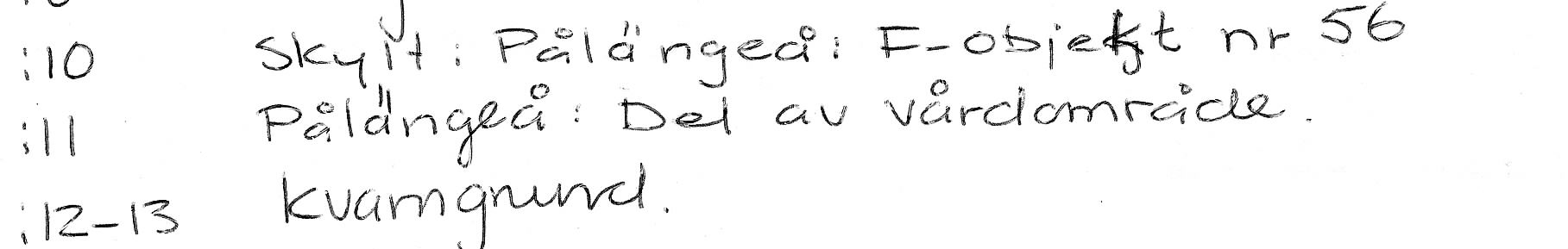 10. Skylt: Pålängeå. Fornminnesvårdsobjekt nr 56. 11. Pålängeå: Del av vårdområde. 12-13. Kvarngrund.