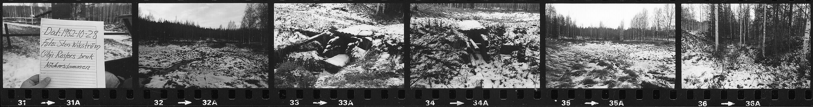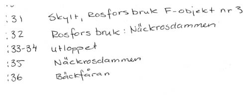 31. Skylt: Rosfors bruk. Fornminnesvårdsobjekt nr 3. 32. Rosfors bruk: Näckrosdammen. 33-34. Utloppet. 35. Näckrosdammen. 36. Bäckfåran.