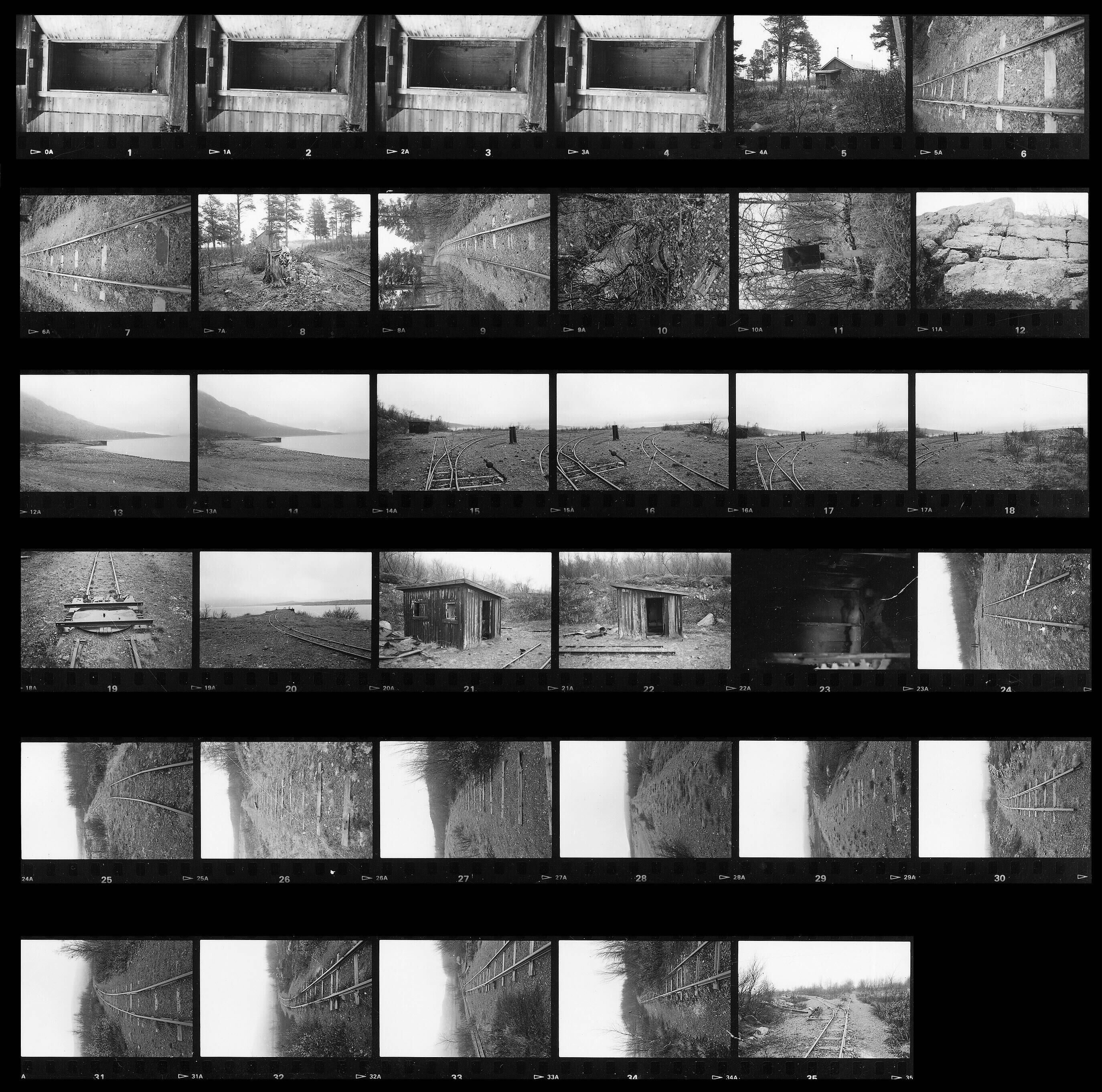 Gällivare sn, Stora Sjöfallet. 1-5. Härbärge/lapphärbärge, ingång. 6. Decauvillebana, träsyll. 7. Decauvillebana, järnsyll. 8. Decauvillebana. Magasinet i bakgrunden. 9. Decauvillebana. 10. Bäck. 11. Stoppsignal 12. Bildbeskrivning saknas. 13-14. Övre bryggan. 15-20. Decauvillespåren vid övre bryggan. 19. Decauvillespåren, vändplatta 21-22. Väntkur vid övre bryggan. 23. Väntkur. Interiör. 24-25. Decauvillespåret. 26-29. Rälsen borttagen på en sträcka vid övre bryggan. 30-34. Decauvillespåret. 35. Spåret till vänster om nuvarande övre bryggan, till höger mot gamla övre bryggan.