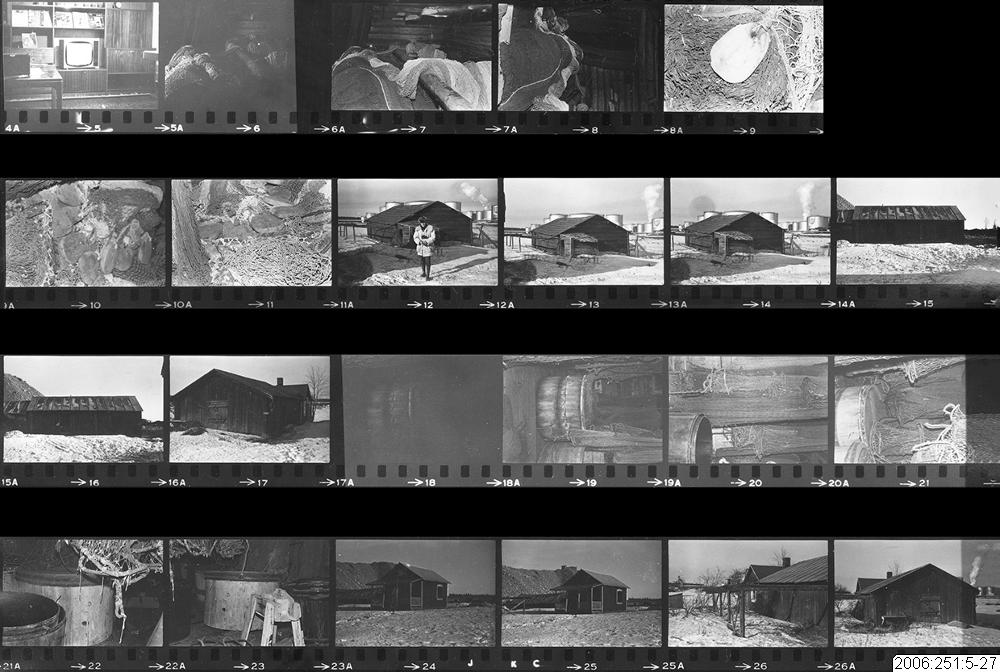 Fiskeläget Uddebo, Strömören, utanför Luleå, där byggnader mm skulle rivas för bygget av Luleås oljehamn. 5 Tv-apparat i en bokhylla 6 Fisknät 7-11. Fiskeutrustning, nät. 12. Antikvarie Kaj Bergman, Norrbottens museum, arbetade med byggnadsdokumentation på museet. (Således är just denna bild fotograferad av någon medföljande person.) 13-16. Ett båthus. 17. En sjöbod. 18-23. Redskap, nät och utrustning i sjöboden. 24-25. En sommarstuga. 26-27. En sjöbod.
