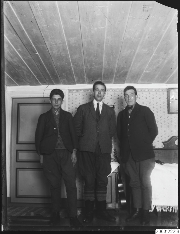 • Bildbeskrivning saknas. Tre män, i helfigur, står i ett rum med lågt i tak.