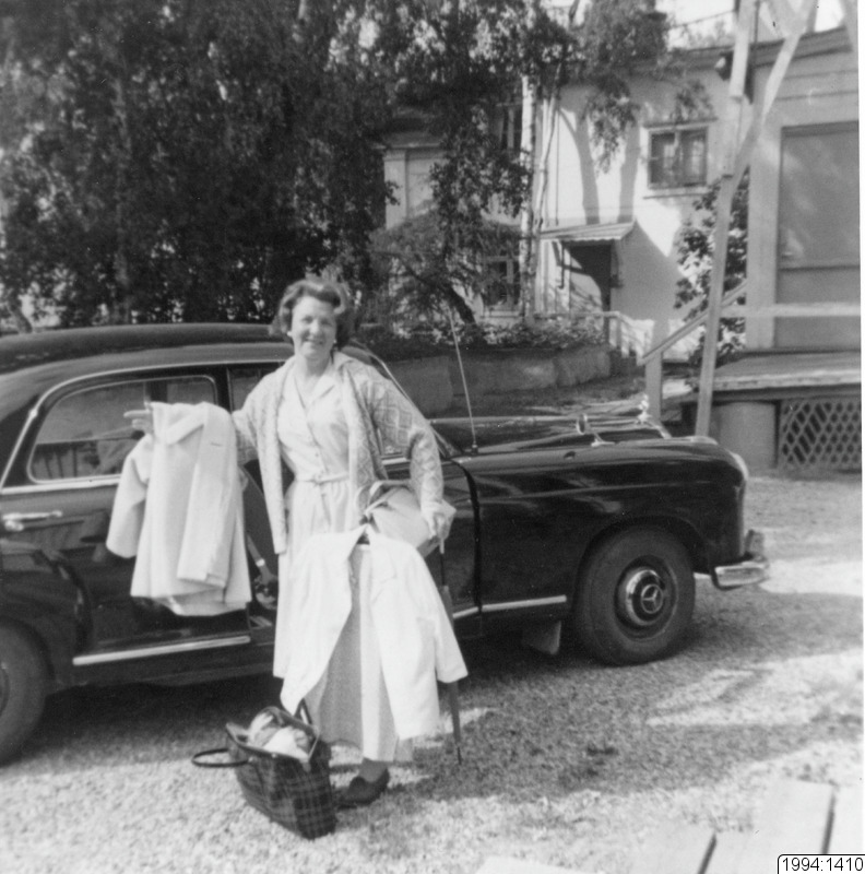 • Kerstin A Sundqvist och hennes Mercedes av1959 års modell. Bilen körs fortfarande sommartid år 1995.