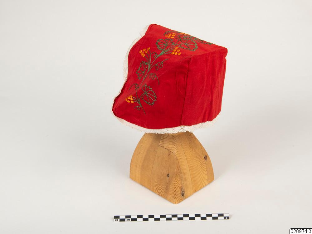 • Bindmössan är röd med broderier och spets. Broderierna föreställer gröna blad med bär eller blommor i en orange färg. Inuti mössan finns det ett rött band.