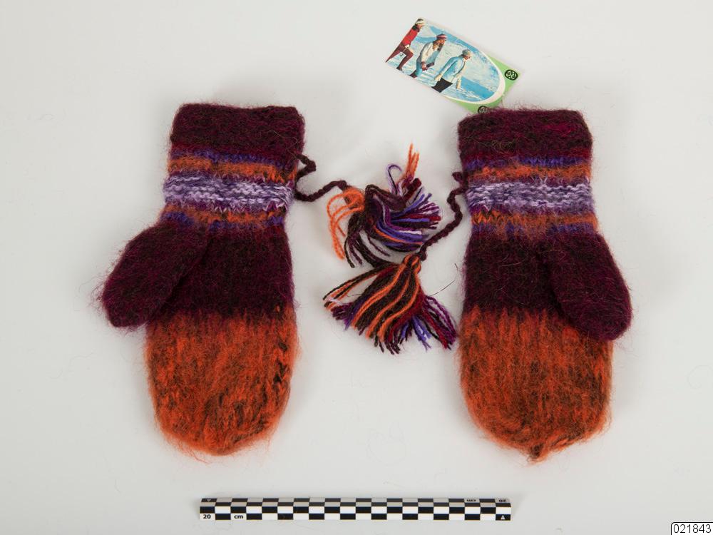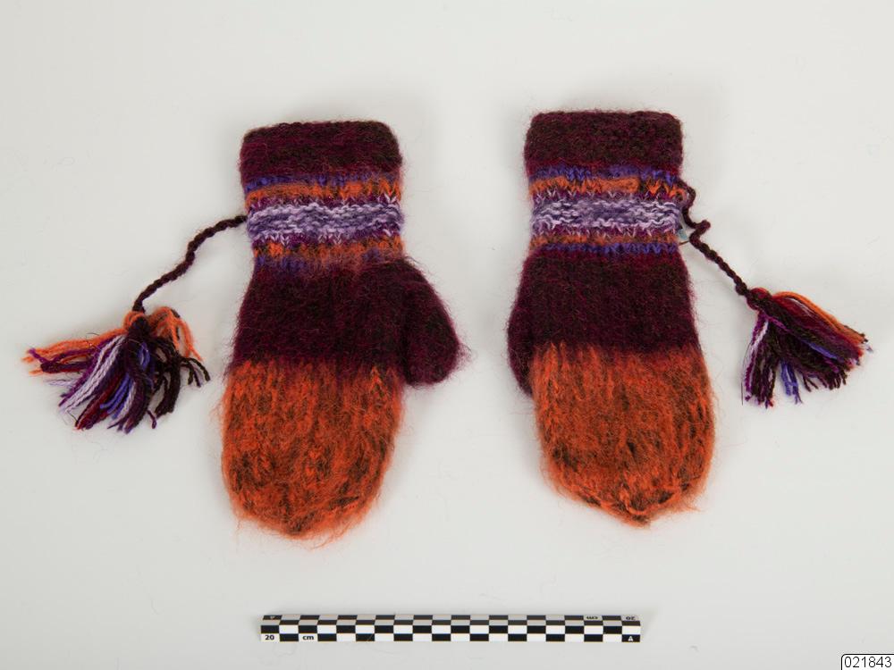 Ett par slätstickade vantar med randigt mönster. Mudden längst ner är rätstickad och dubbelstickad i en plommonlila färg. Vanten har ränder från mudden upp till början av tummen. Ränderna är lila, ljuslila blandat med glittertråd samt orange blandat med brun. En rand är rätstickad. mitten av vanten och tummen är plommonlila. Översta delen för fingrarna är orange blandat med brunt. Vid handleden sitter en tofs med alla färger som finns i vanten. På insidan sitter en tyglapp med texten "maj wennberg design kiruna sweden", "helylle", samt en logotyp och en tvättanvisning "30°". Fäst med en tråd i lappen sitter en lapp i papp. Ena sidan har ett fotografi som föreställer tre kvinnor klädda i vinterkläder framför ett snötäckt fjäll. På andra sidan av lappen står information om vantarna "namn: "HÖSTHED", "modell: MOSSRAND-MÖNSTERVANTE (TILL LUVA!)", "M", "PROV".