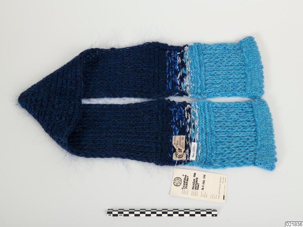 En rätstickad halsduk i mörk och ljusblått. Ändarna på halsduken är ljusblå ca 15 cm in. Kanten är invikt och fäst på avigsidan. Den ljusblå färger slutar i ett sicksackmönster. En vit rand följer sicksackmönstret, därefter en mörkblå färg och sedan en blå med silvertråd. Resten av halsduken är mörkblå. På avigsidan sitter en tyglapp med texten "maj wennberg design kiruna sweden", "HELYLLE", samt en logotyp och en tvätanvisning "30°". Fäst med en tråd i lappen sitter en lapp i papp. Ena sidan har ett fotografi av en kvinna klädd i vinterkläder framför ett snötäckt fjäll. På andra stidan står information om halsduken "namn: SILVERBLÅ JOKKEN", "modell: HALSDUK MED INSTICKAD KANT", "16x100 CM".
