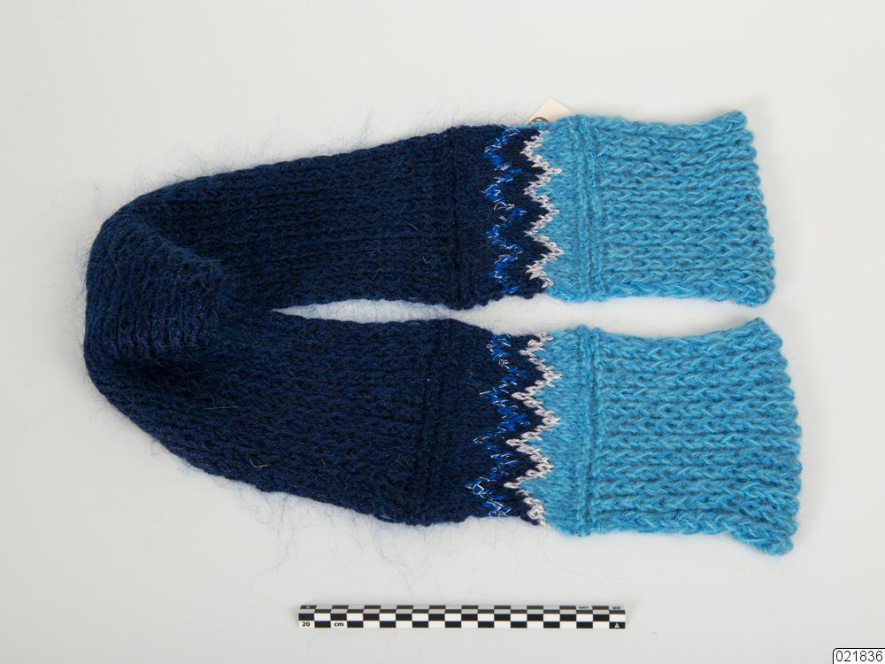 En rätstickad halsduk i mörk och ljusblått. Ändarna på halsduken är ljusblå ca 15 cm in. Kanten är invikt och fäst på avigsidan. Den ljusblå färger slutar i ett sicksackmönster. En vit rand följer sicksackmönstret, därefter en mörkblå färg och sedan en blå med silvertråd. Resten av halsduken är mörkblå. På avigsidan sitter en tyglapp med texten "maj wennberg design kiruna sweden", "HELYLLE", samt ...