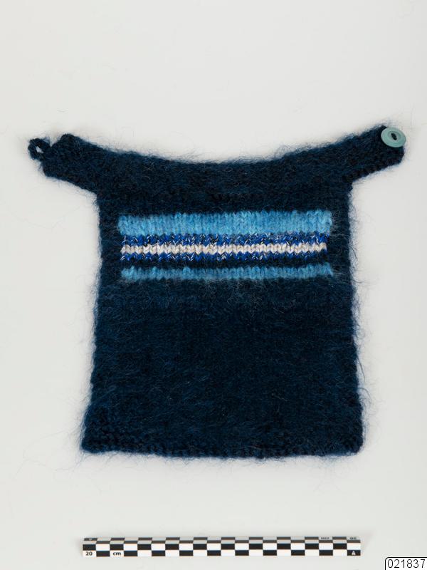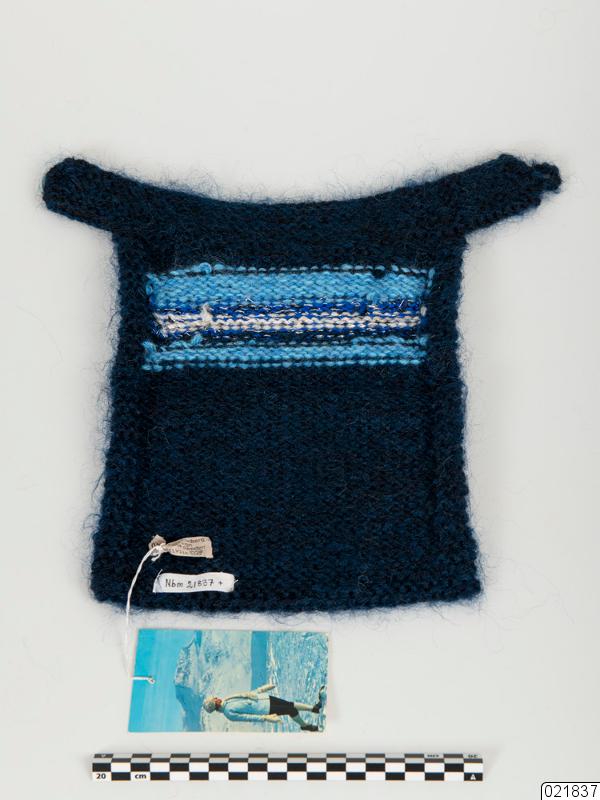 Ett slätstickat halsskydd med randigt mönster. Halsskyddet är mörkblått och har ett randigt mönster under kragen. Ränderna är ljusblå, vita och blå-svarta med silvertråd. Nederdelen är mörkblå. Halsskyddet har en rätstickad krage i mörkblått. I ena sidan sitter en blå plastknapp och i andra en stickad ögla. Nederkanten är rätstickad i mörkblått. På insidan sitter en tyglapp med texten "maj wennber...