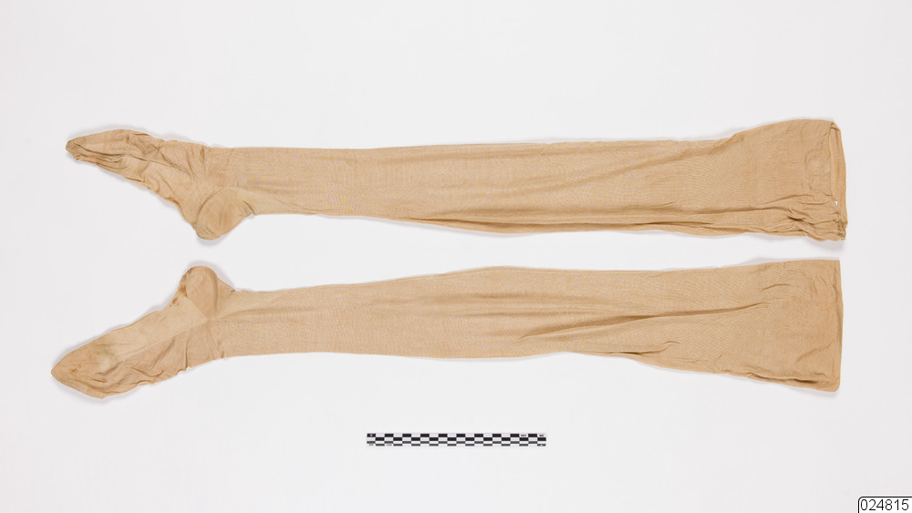 • Ett par beigea nylonstrumpor som går upp till låret. Strumporna har en söm baktill längs hela benet. Foten har ett tjockare nylontyg på undersidan och över tån.