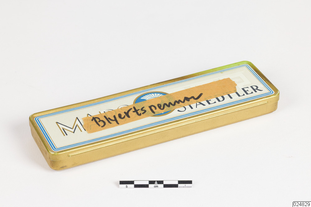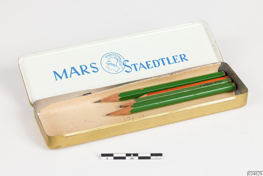 Ett pennskrin i guldig metall. Skrinet har ett lock som öppnas på gångjärn. Locket är vitt på ovansidan med en blå ram. På locket stor texten "MARS STAEDTLER". På mitten av locket är en logotyp som föreställer guden Mars, iklädd en hjälm med borst. Guden mars var i romersk mytologi krigsguden. Logotypen har en blå bakgrund. En bit maskeringstejp har tejpats ovanpå locket. På tejpen står det skrivet i tusch "Blyertspennor". På lockets baksida står det "GERMANY". Locket är vitt på insidan med samma text och logotyp som på ovansidan. I pennskrinet ligger en bit papper som täcker insidan. Där ligger fyra blyertspennor, tre gröna och en röd.