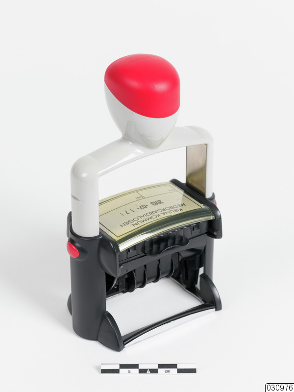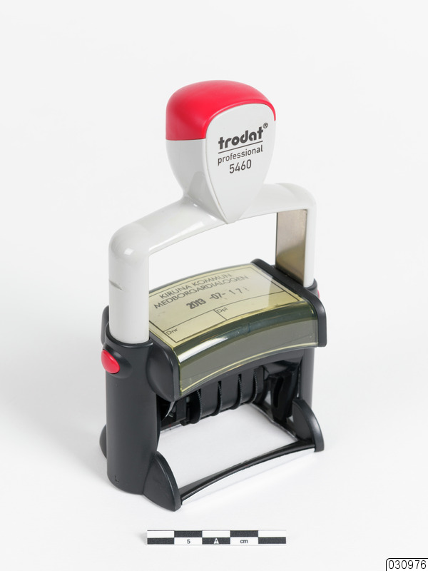 Stativdatumstämpel med inbygd utbytbar stämpeldyna. På toppen av stativdatumstömpeln står företagsnamnet på tillverkaren "trodat" och modellserie "professional, 5460". På stämpeln står "KIRUNA KOMMUN MEDBORGARDIALOGEN" där efter står datumet i formatet år-månad-dag, datumet går att ändra genom ställbara hjul ovanför stämpeln. Under datumet på stämeln är två fält ett med förkortningen "Dnr" (Diarienummer) och "Dpl" (Diarieplanbeteckning).