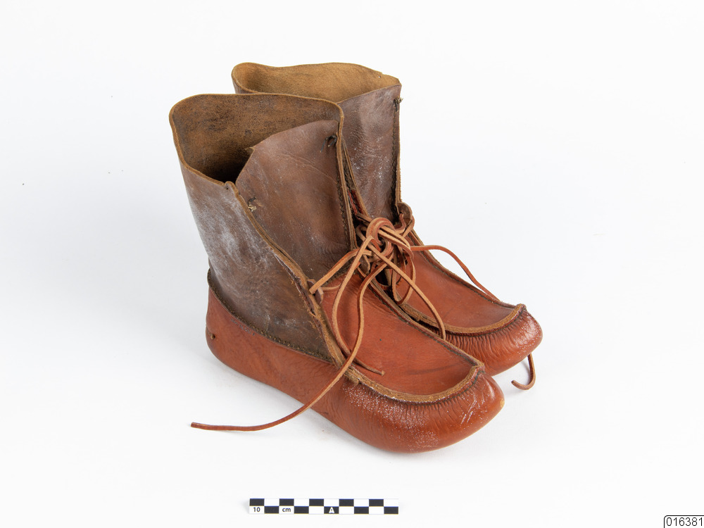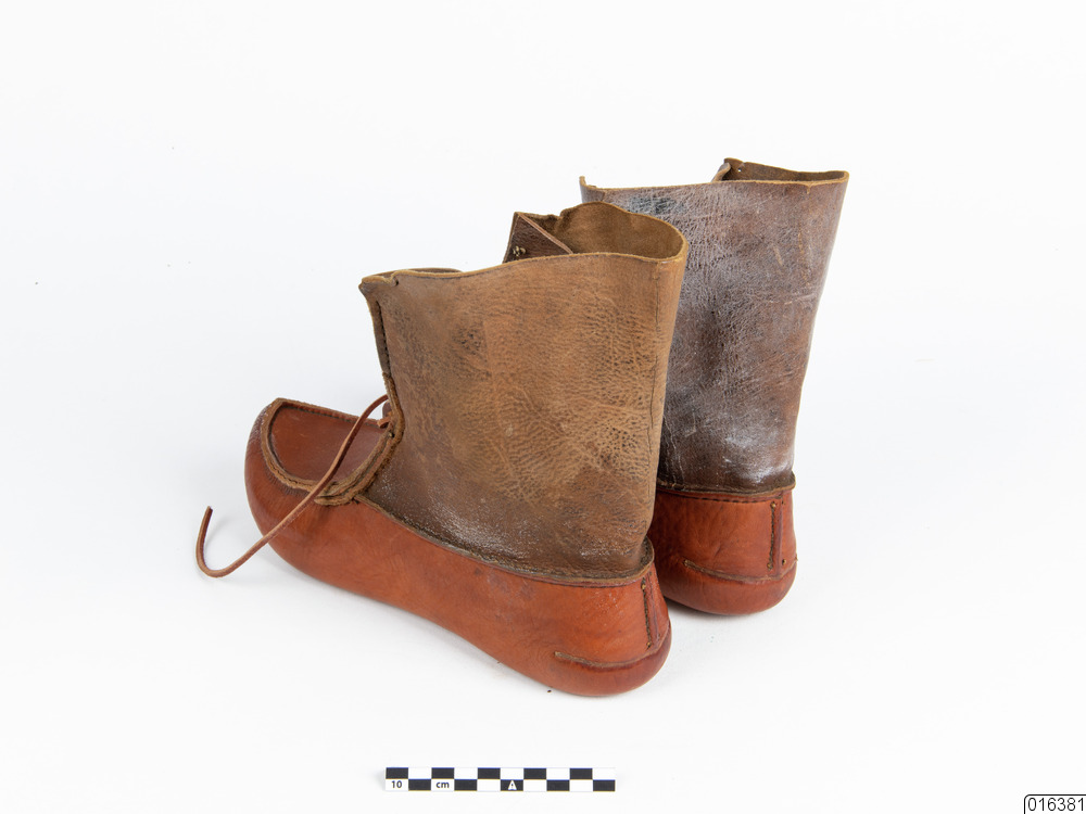 Ett par bandskor i näbbmodell med kort skaft. Dam- och pojkstorlek. Sula och sidor format av ett stycke. Skaftet sytt av två stycken. I skaftsömmarna framtill, längst ner, är insytt två öglor för lädersnöret som hör till var sko. Snöret viras runt vristen och knytes fram. Under sulan har skrivits med tusch: "30". Antal delar: 3 st.