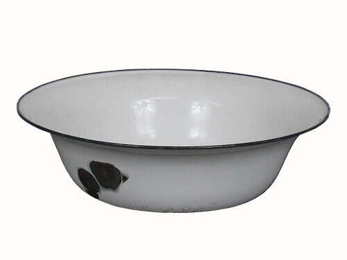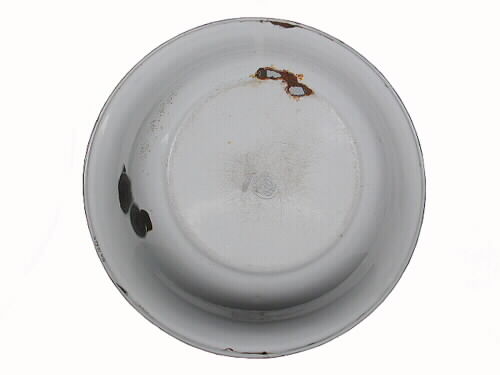 Vitt emaljerat tvättfat med blå kant, två rosthål i botten. Emaljen skadad på två ställen invändigt och fem ställen utvändigt. Blå stämpel under med flagga och text "K.E.R. SWEDEN 26 cm".
