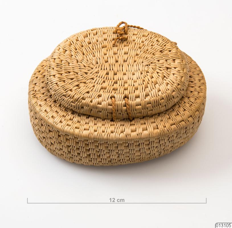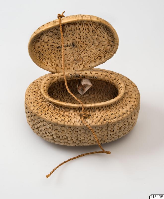 • Ask. Oval naturfärgad rotask med lock, fästad med smal tvinnad lädersnodd.