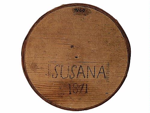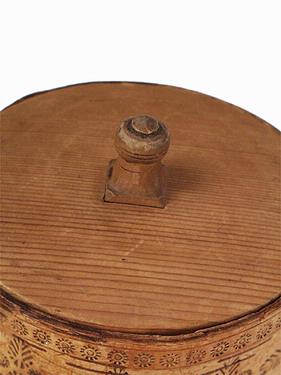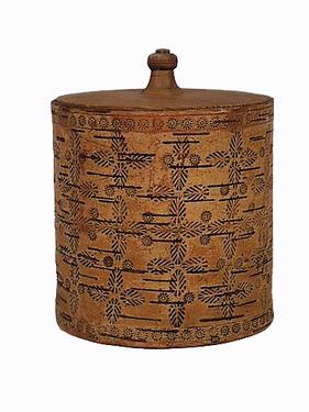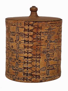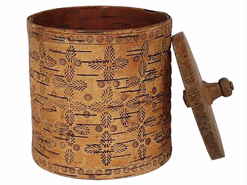 • Ask. Ornerad ask av näver med lock av trä. Den är märkt: "Susana 1871". Antal delar 2 st.
