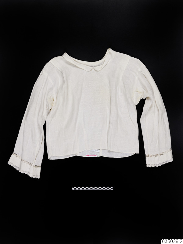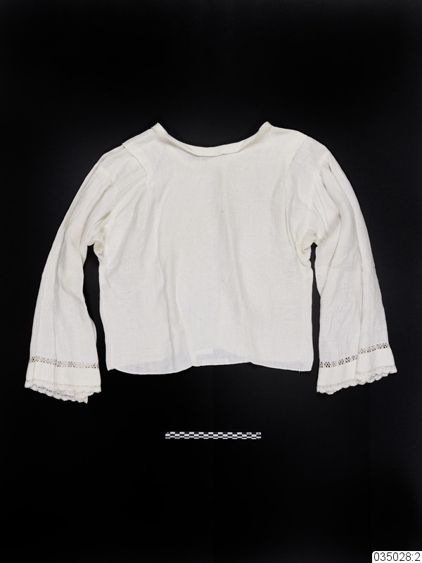 Kort blus/särk sydd i linne. Helt framstycke. Lagda veck över vardera axel. Två insyningar från midjan och uppåt på både fram och bakstycke. Vida ärmar, rynkade över axeln och kantade med spets, samt dekorerade med en infäld spetsbård i hålsöm 5 cm in på ärmen. Tre cm bred krage, med rundade snibbar. Nedtill, på insidan av bakstycket, sitter en vit märklapp fastsydd, med texten "Ingeborg Stenberg"...