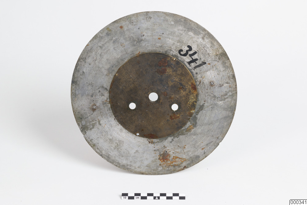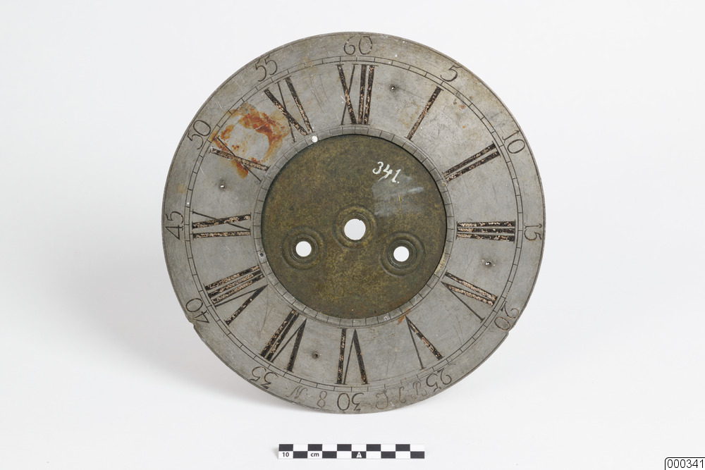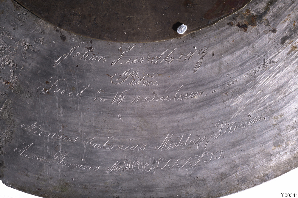 Urtavla till väggur, i bly och mässing. Ingraverat på tavlans baksida: "Johan Lundberg Piteå - Fecit in 16 november in medio(?) Nikolaus Antonius Montelius Pitovia Anno Domino MDCCCLXXXVII (1887)". Detta syftar förmodligen på givaren, Nils Anton Berglund.