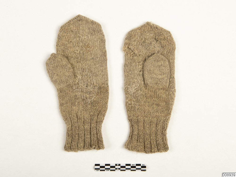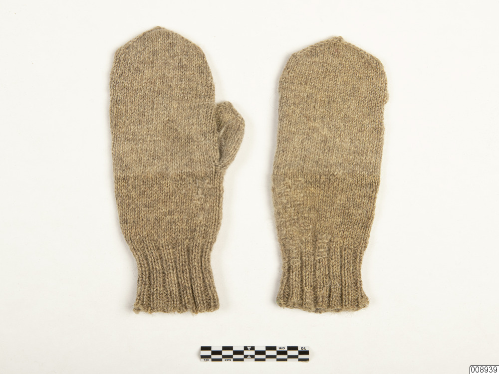 • Vante. Ett par hemstickade damvantar i grått ullgarn med 7 cm bred resår i överkanten, i övrigt slätstickade.