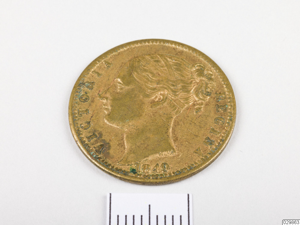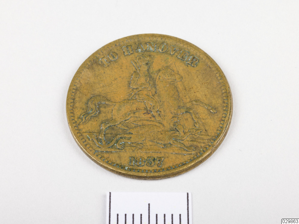 En pollett från Storbritannien. The tokens & counters that bear the words "To Hanover" (commonly known as Cumberland Jacks) are usually found with Victoria's portrait on the obverse and a figure riding a horse on the reverse (in the style of St George slaying the dragon). They were produced as satirical counters.The history behind these pieces is that when Victoria was crowned as Queen, she was unable to fulfil the role of King of Hanover under Salic Law, due to the fact that she was a female. Her unpopular Uncle (Ernest Augustus, the Duke of Cumberland) who was the oldest male heir to the throne was sent off to Hanover instead to fulfil the role, and the counters/tokens were produced to commemorate (celebrate) his departure. Such was his unpopularity that many of the tokens on closer inspection actually depict a monkey on horseback which was intended to portray the Duke. They were produced around the time of Victoria's ascension to the throne in 1837, and continued to be produced for the next few decades. They were finally made illegal in 1883.